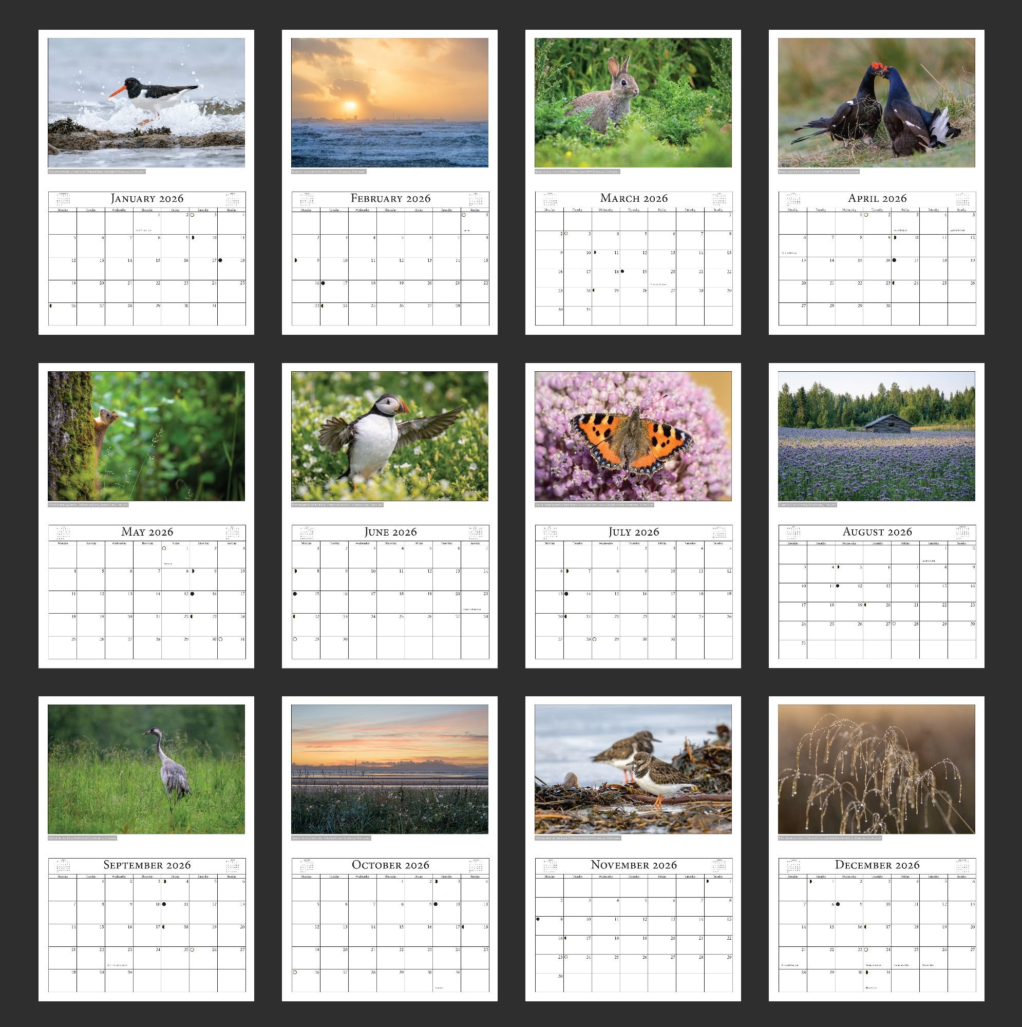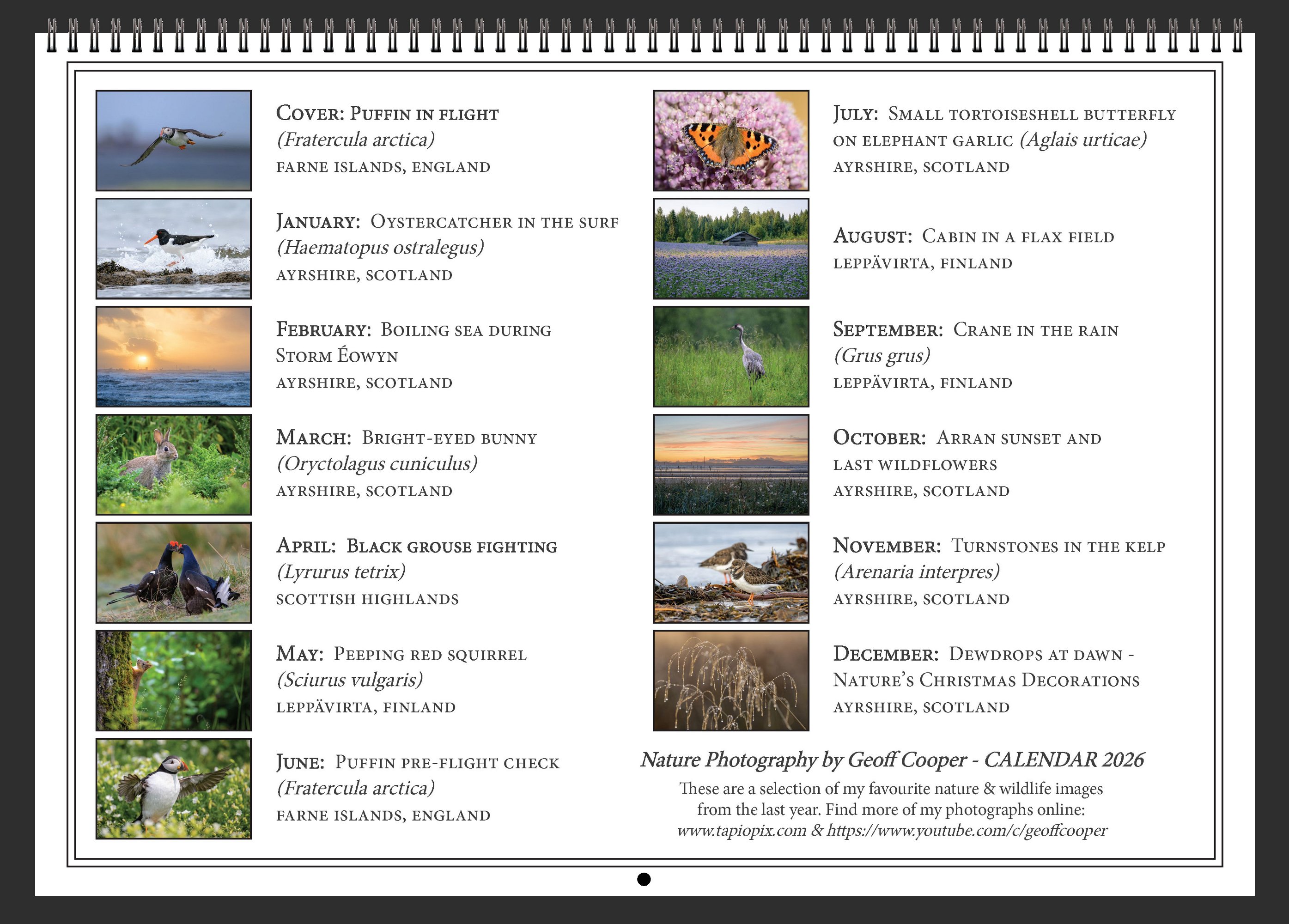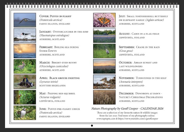 My 2026 Calendar shows thirteen of my favourite nature and wildlife photographs from the past year. I will be printing the calendars in batches on demand and all orders submitted before the 8th December 2025 should be processed in time for Christmas! Click on the 🛒 icon on any of the preview images below to purchase.